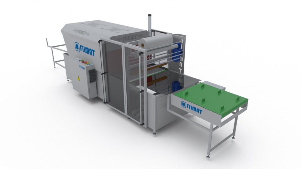 Osadzony na jednej ramie tunel obkurczający z maszyną owijającą w tuleję z taśmy folii termokurczliwej.